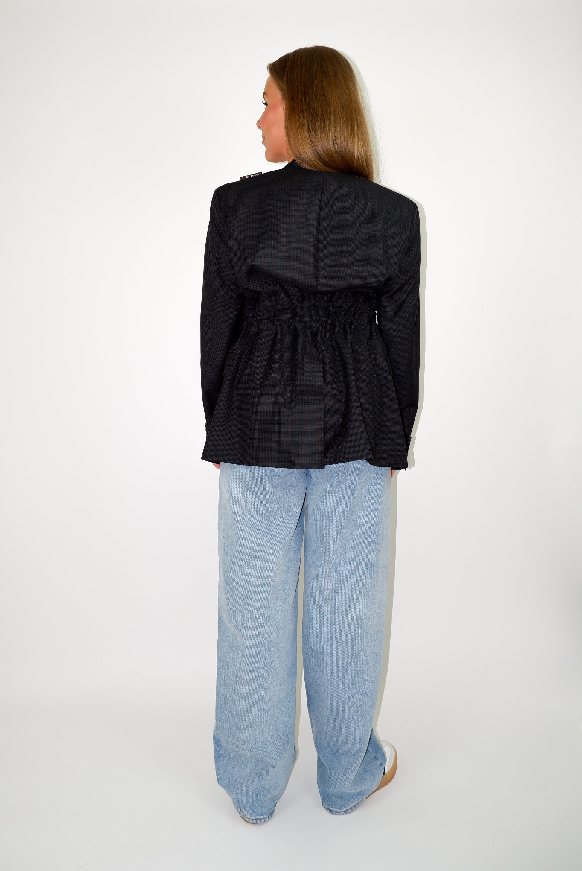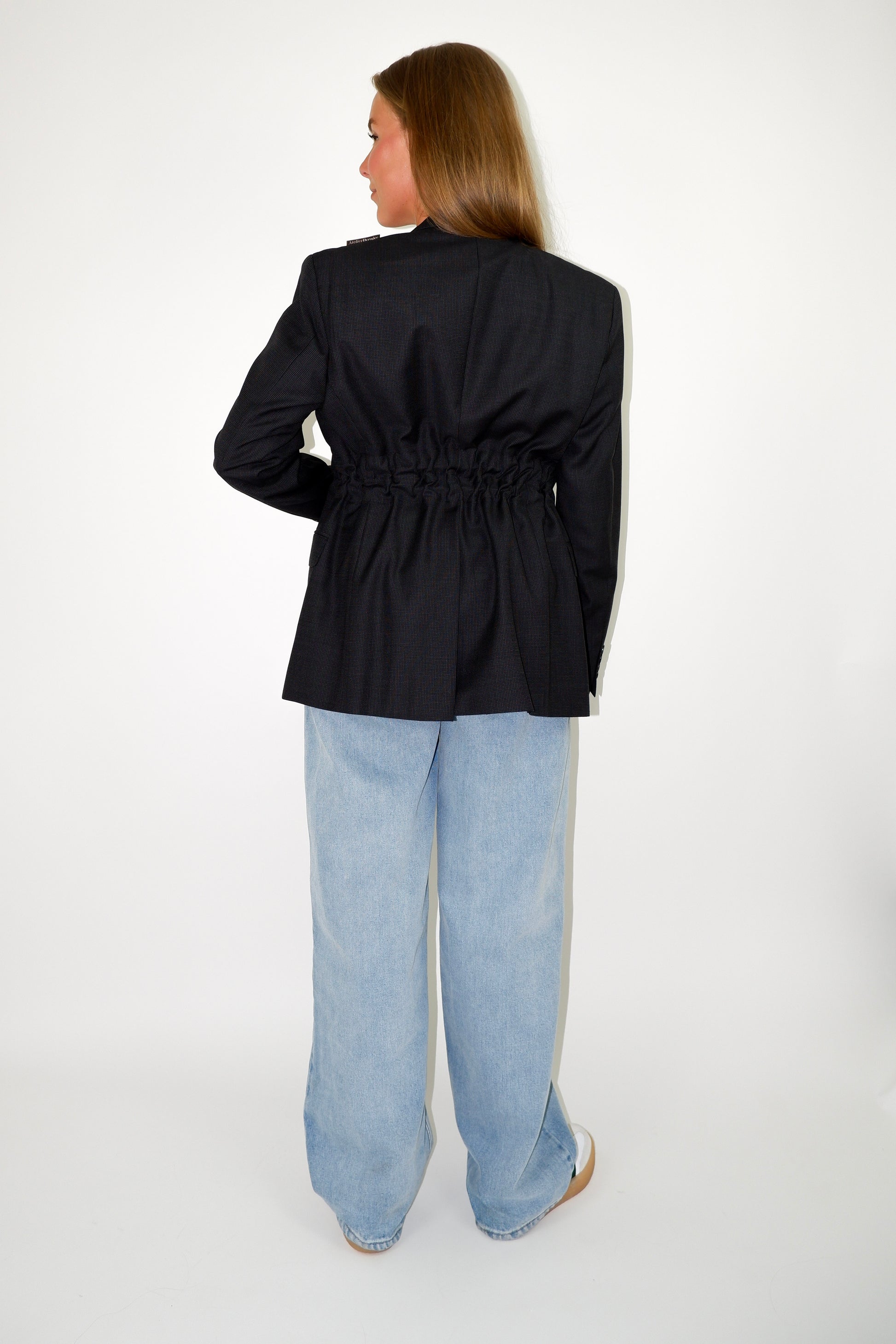 De verstelbare tailleband laat je kiezen tussen een elegant silhouet of een oversized look, afgestemd op elke gelegenheid. Het label voegt een exclusief detail toe aan dit tijdloze statement piece.